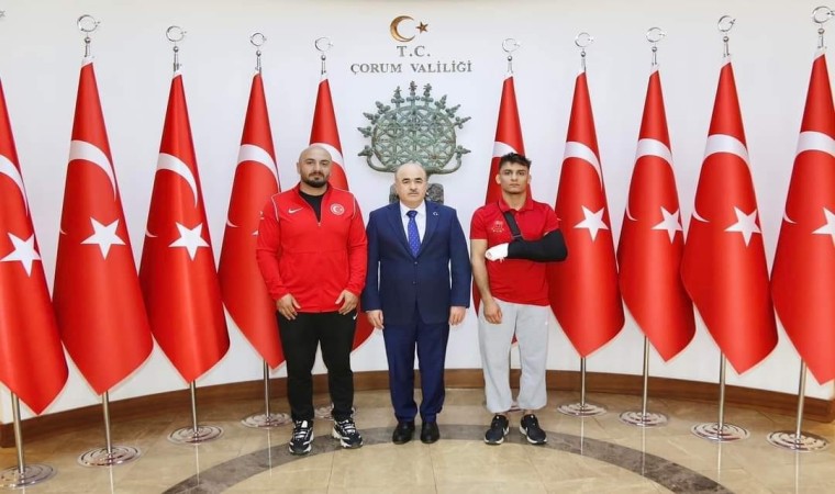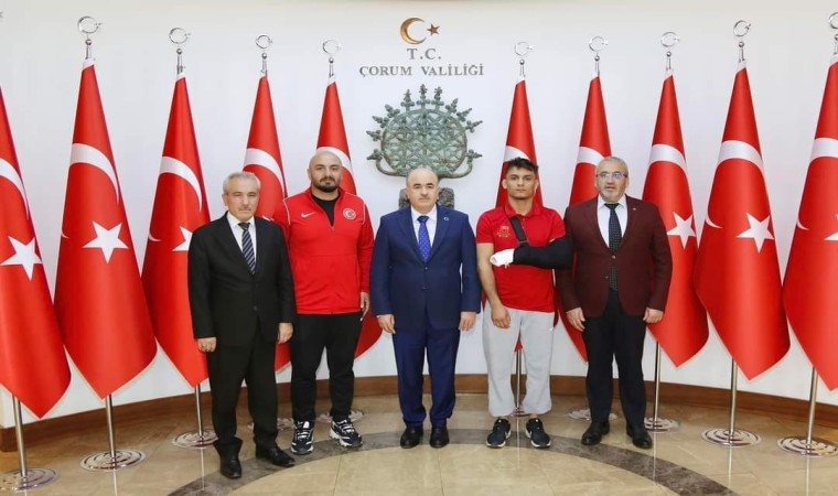 Çorum Valisi Doç. Dr. Zülkif Dağlı, Bakü’de düzenlenen U23 Avrupa Güreş Şampiyonasında 60 kg grekoromen stilde Avrupa şampiyonu olarak altın madalya kazanan milli sporcu Mert İlbars, antrenörü Çelebi Bayır ve İlçe Spor Müdürü Mehmet Aktaş’ı makamında kabul etti.