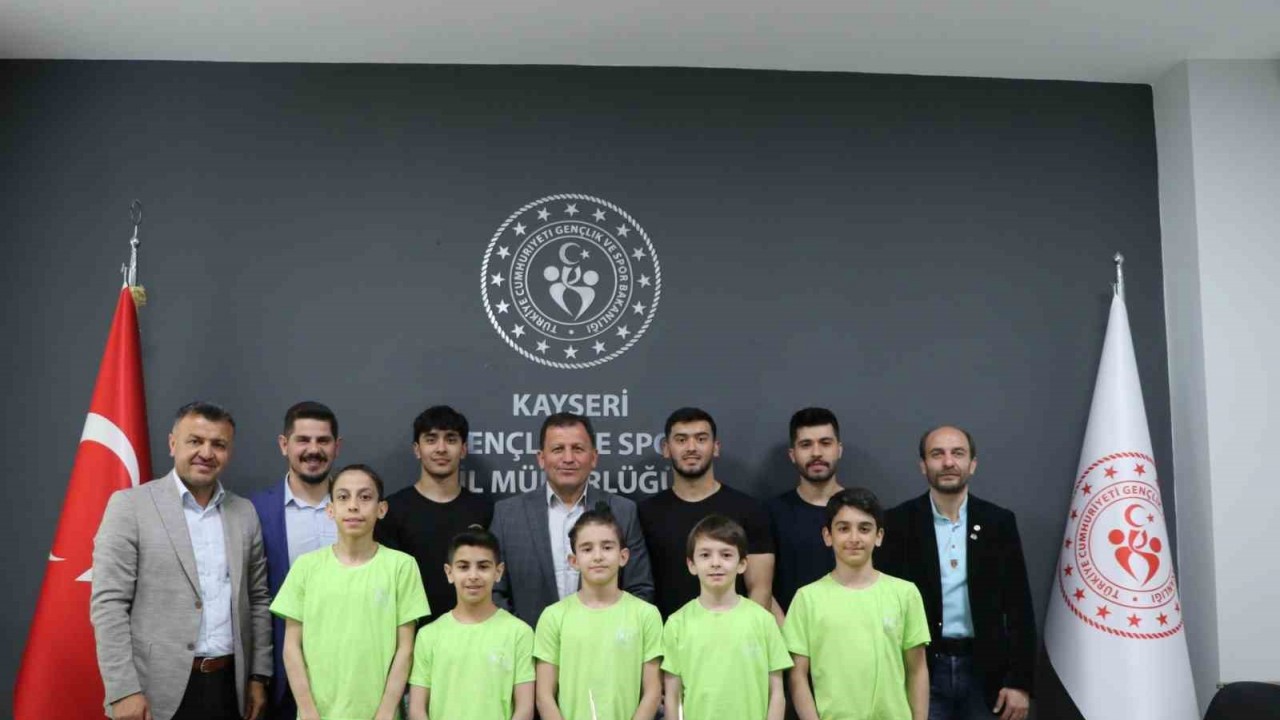 Türkiye Şampiyonası’nda büyük bir başarıya imza atarak Kayseri’ye dönen Hasan Bulut, Mert Efe Kılıçer, Hüseyin Emir Cünedioğlu, Mehmet Eren Kökoğlu, Göktuğ Ömer Ceylan, Onurhan Demir ve Hüsnü Aktaş, antrenörleri Mehmet Bilgin ve Aziz Baran Atay, Gençlik ve Spor İl Müdürü Ali İhsan Kabakcı’yı makamında ziyaret etti.