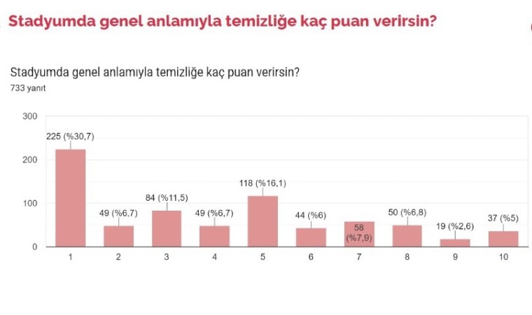 “Stadyumda genel anlamıyla temizliğe kaç puan verirsin?” sorusuna 10 üzerinden “1” puan veren taraftarlar, genel anlamıyla güvenlik önlemlerine ilişkin soruya da 5 üzerinden “5” tam puan verdi.