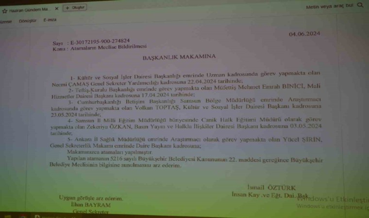 Komisyona havale edilmeyen tek madde, “Yapılan atamaların meclis bilgisine sunulması” maddesi oldu. Söz konusu bilgilendirmede Necmi Çamaş’ın ‘Genel Sekreter Yardımcılığı’ görevine getirildiği, müfettiş Emrah Binici’nin ‘Mali Hizmetler Dairesi Başkanı’ olarak atandığı, İletişim Başkanlığı’nda görevli Volkan Toptaş’ın ‘Kültür ve Sosyal İşler Dairesi Başkanı’ olarak atandığı, Canik Halk Eğitim Müdürü Zekeriya Özkan’ın ‘Basın, Yayın ve Halkla İlişkiler Dairesi Başkanı’ kadrosuna atandığı ve Ankara Sağlık İl Müdürlüğü’nde görevli Yücel Şirin’in de ‘Genel Sekreterlik Makamı’ emrinde daire başkanı kadrosu olarak atandığı bilgilere sunuldu.