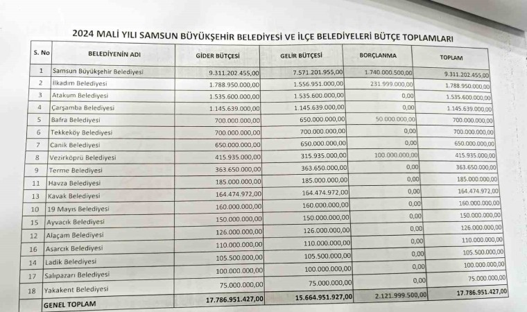 SAMSUN (İHA) – Samsun Büyükşehir Belediyesi ve 17 ilçesinin 2024 yılı toplam mali bütçesi 17 milyar 786 milyon TL olarak mecliste kabul edildi.