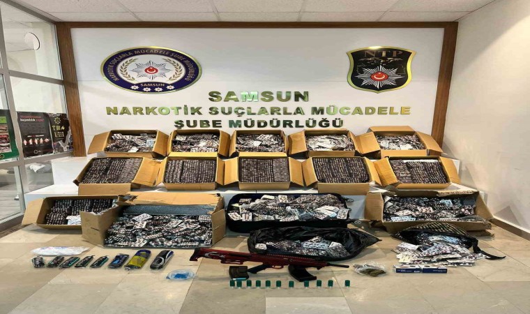 Narkotik polisi ve İstihbarat Şube Müdürlüğü ekipleri Atakum ilçesi Denizevleri Mahallesi’nde düzenledikleri operasyonunda 114 bin 226 adet sentetik ecza, 18,90 gram skunk maddesi, 62 adet extacy hap, 11 gram extacy tozu, 1 adet ruhsatsız tüfek,