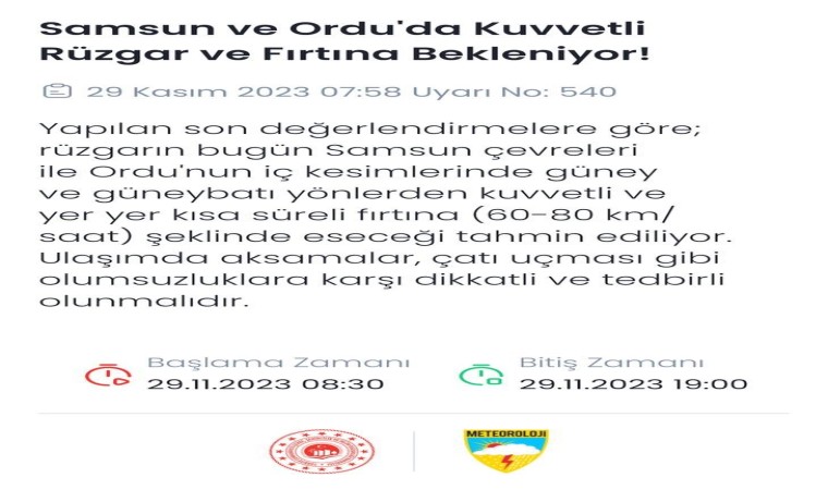 Meteoroloji Genel Müdürlüğünden yapılan açıklamada, bugün (29 Kasım) Samsun ve Ordu’da şiddetli rüzgar ve fırtına beklendiği duyuruldu. Yapılan uyarıda dikkatli olunması gerektiği belirtilerek, “Yapılan son değerlendirmelere göre rüzgarın bugün Samsun çevreleri ile Ordu’nun iç kesimlerinde güney ve güneybatı yönlerden kuvvetli ve yer yer kısa süreli fırtına (60-80 kilometre saat) şeklinde eseceği tahmin ediliyor. Ulaşımda aksamalar, çatı uçması gibi olumsuzluklara karşı dikkatli ve tedbirli olunmalıdır” denildi.
