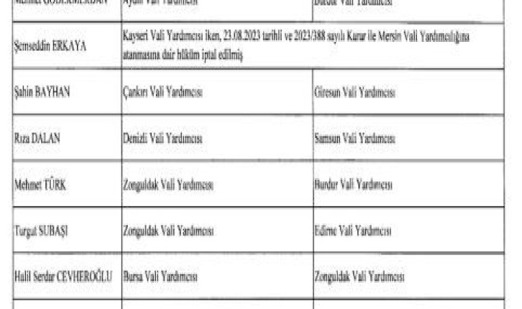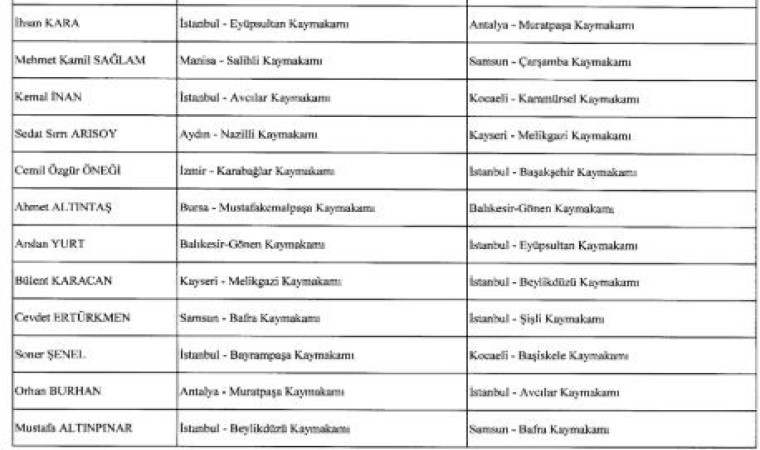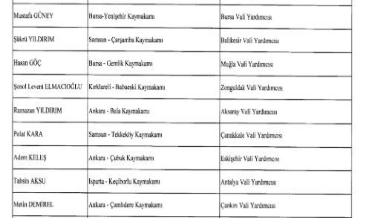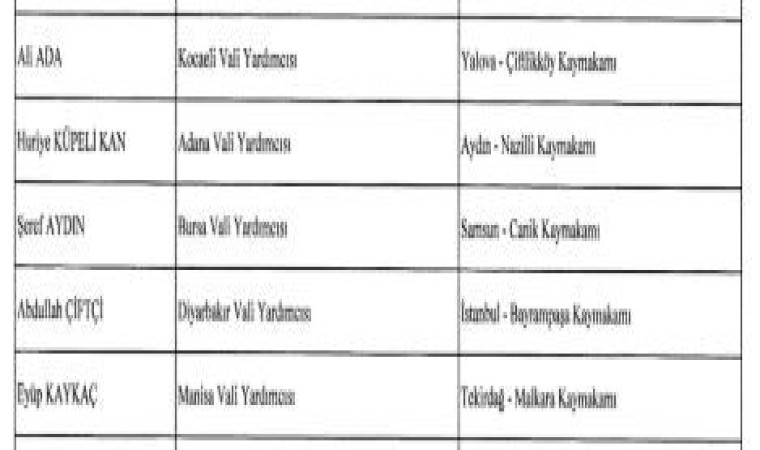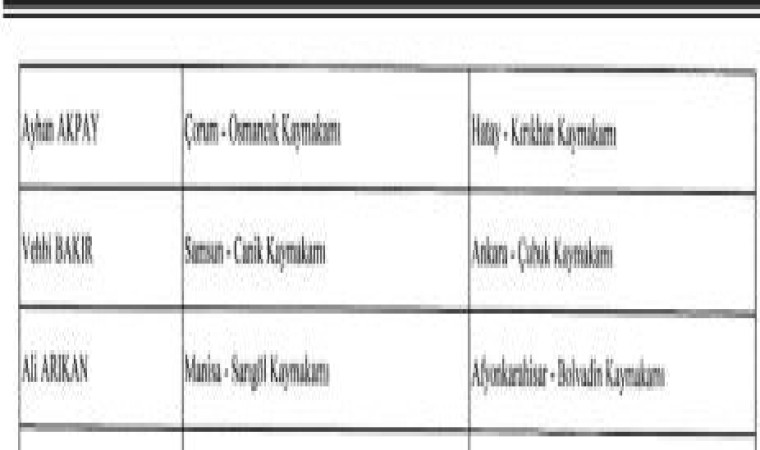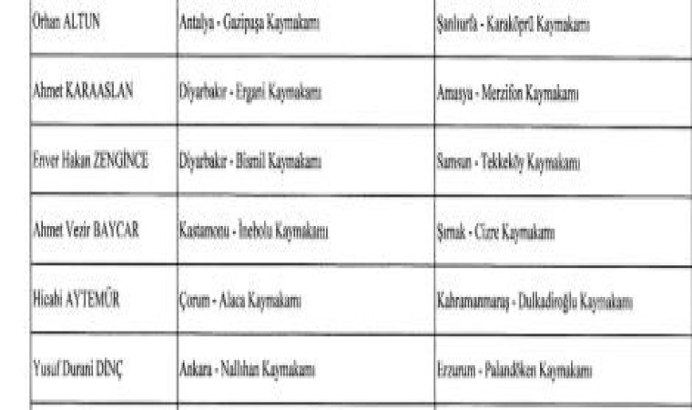 6 ilçedeki mevcut kaymakamların yeni görev yerleri de şu iller oldu: