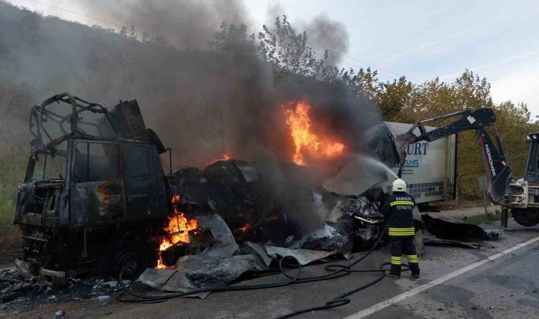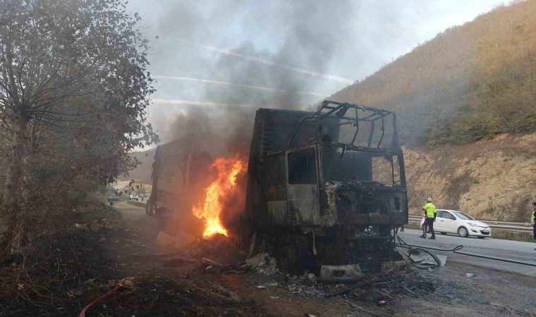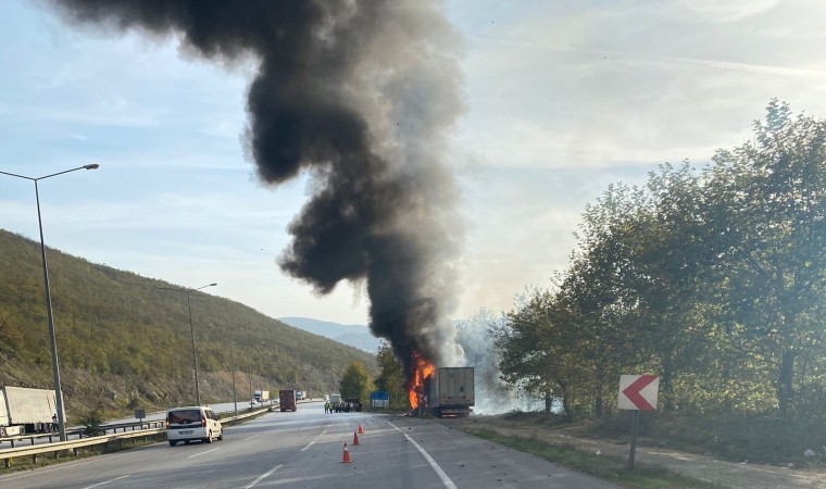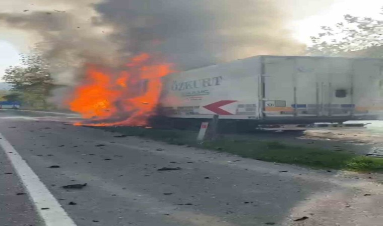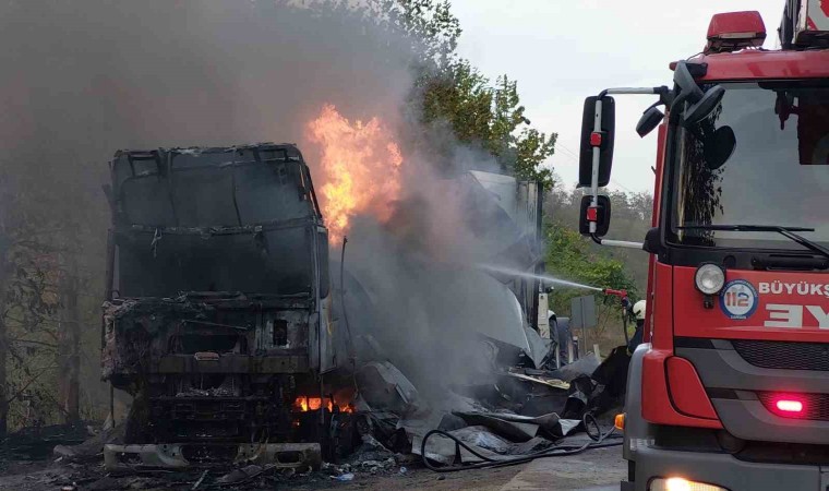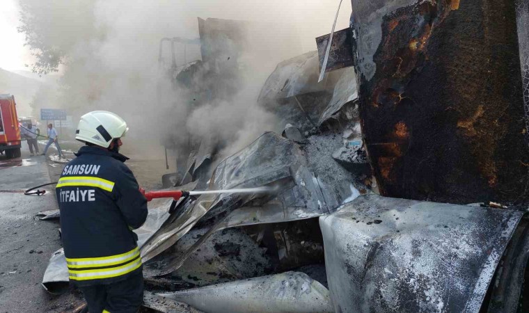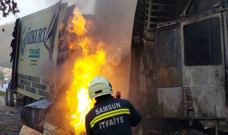 Samsun’da 21 ton PVC hammaddesi yüklü tır, seyir halindeyken alev alev yandı.