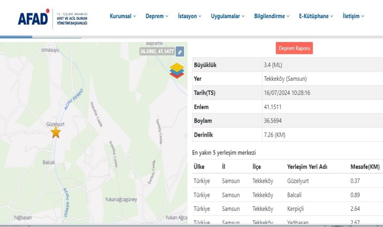 AFAD’dan paylaşılan bilgiye göre, saat 13.28’de merkez üssü Samsun’un Tekkeköy ilçesi Güzelyurt Mahallesi olan, yerin 7.26 km altında 3.4 büyüklüğünde bir deprem kaydedildi. Deprem Samsun merkezde de hissedildi. Sarsıntı dolayısıyla herhangi bir olumsuzluğun yaşanmadığı bildirildi.
