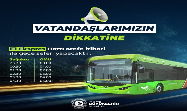 Belediye, toplu taşıma imkanlarını geceye de taşıyarak E1 Ekspres Hattı’nın gece seferlerini başlatıyor. Arefe günü itibarıyla gece seferlerine başlayan E1 Ekspres Hattı ile vatandaşlar ulaşımını daha kolay, güvenli ve konforlu bir şekilde sağlayabilecekler.