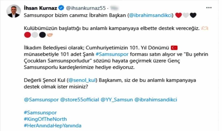 Kampanyaya destek veren İlkadım Belediye Başkanı İhsan Kurnaz, "Samsunspor bizim canımız İbrahim Başkan. Kulübümüzün başlattığı bu anlamlı kampanyaya elbette destek vereceğiz. İlkadım Belediyesi olarak; Cumhuriyetimizin 101. yıl dönümü münasebetiyle 101 adet şanlı Samsunspor forması satın alıyor ve ’Bu şehrin çocukları Samsunsporludur’ sözünü hayata geçirmek üzere genç Samsunsporlu kardeşlerimize hediye ediyoruz. Değerli Şenol Kul Başkanım, siz de bu anlamlı kampanyaya destek olmak ister misiniz?" dedi.