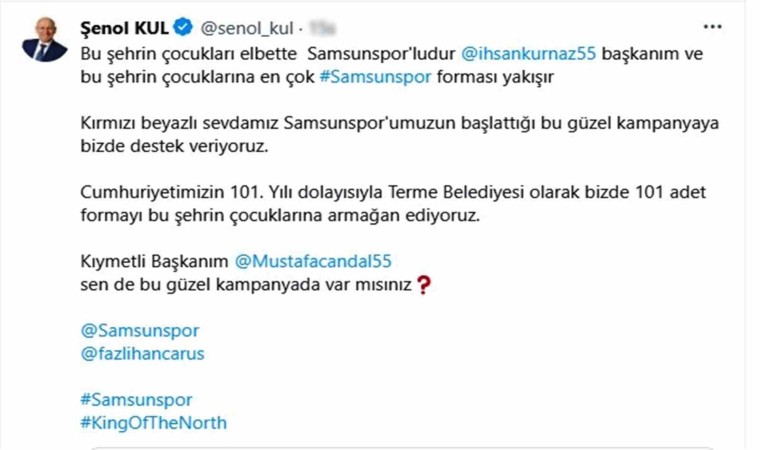 Başkan Şenol Kul da çağrıya kayıtsız kalmayarak, "Bu şehrin çocukları elbette Samsunsporludur İhsan Kurnaz başkanım ve bu şehrin çocuklarına en çok Samsunspor forması yakışır. Kırmızı-beyazlı sevdamız Samsunspor’umuzun başlattığı bu güzel kampanyaya bizde destek veriyoruz. Cumhuriyetimizin 101. yılı dolayısıyla Terme Belediyesi olarak bizde 101 adet formayı bu şehrin çocuklarına armağan ediyoruz. Kıymetli Başkanım Mustafa Candal sen de bu güzel kampanyada var mısınız?" diye konuştu.