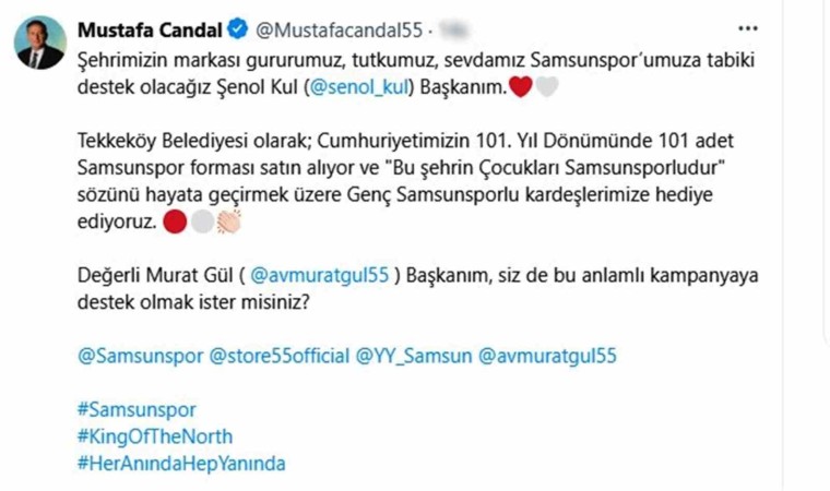 Tekkeköy Belediye Başkanı Mustafa Candal paylaşımlara, "Şehrimizin markası gururumuz, tutkumuz, sevdamız Samsunsporumuza tabi ki destek olacağız Şenol Kul Başkanım. Tekkeköy Belediyesi olarak; Cumhuriyetimizin 101. yıl dönümünde 101 adet Samsunspor forması satın alıyor ve ‘Bu şehrin Çocukları Samsunsporludur’ sözünü hayata geçirmek üzere genç Samsunsporlu kardeşlerimize hediye ediyoruz. Değerli Murat Gül Başkanım, siz de bu anlamlı kampanyaya destek olmak ister misiniz?" paylaşımında bulunarak Vezirköprü Belediye Başkanı Gül’ü davet etti. Başkan Gül de kampanyaya 101 adet forma alarak destekte bulundu.