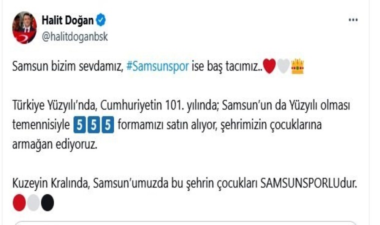 Samsunspor’un forma kampanyasına destek veren Samsun Büyükşehir Belediye Başkanı Halit Doğan, "Samsun bizim sevdamız, Samsunspor ise baş tacımız. Türkiye Yüzyılı’nda, Cumhuriyet’in 101. yılında; Samsun’un da yüzyılı olması temennisiyle 555 formamızı satın alıyor, şehrimizin çocuklarına armağan ediyoruz. Kuzeyin kralında, Samsunumuzda bu şehrin çocukları Samsunsporludur" ifadelerini kullandı.