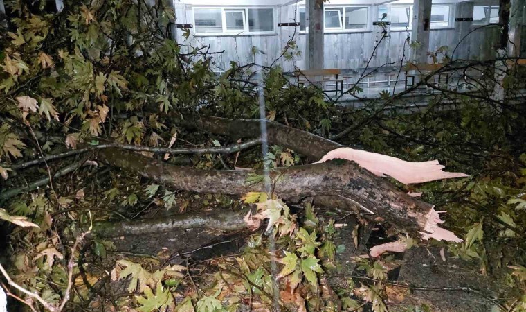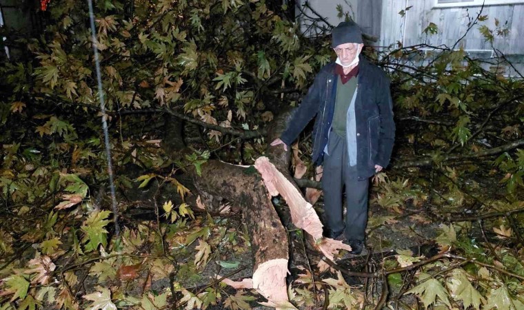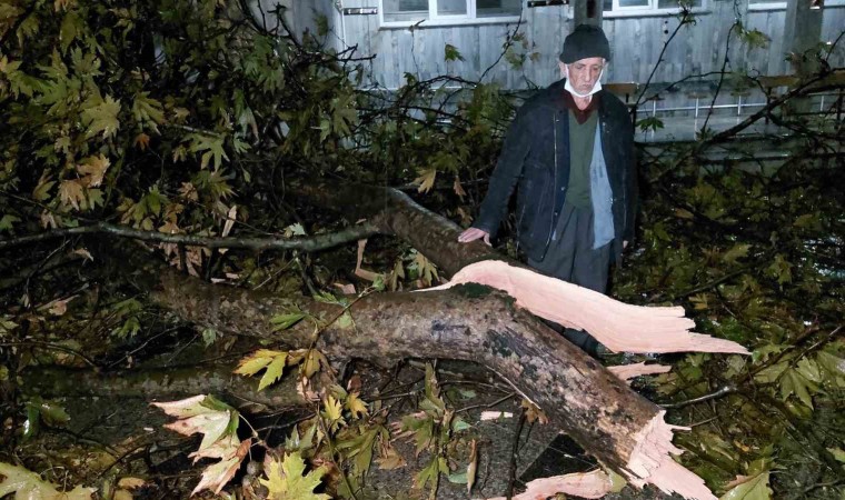 Samsun’da şiddetli rüzgarda cami avlusundaki çınar ağacı gövdesinden kırıldı. Olayın namaz saatinde yaşanmaması faciayı önledi.