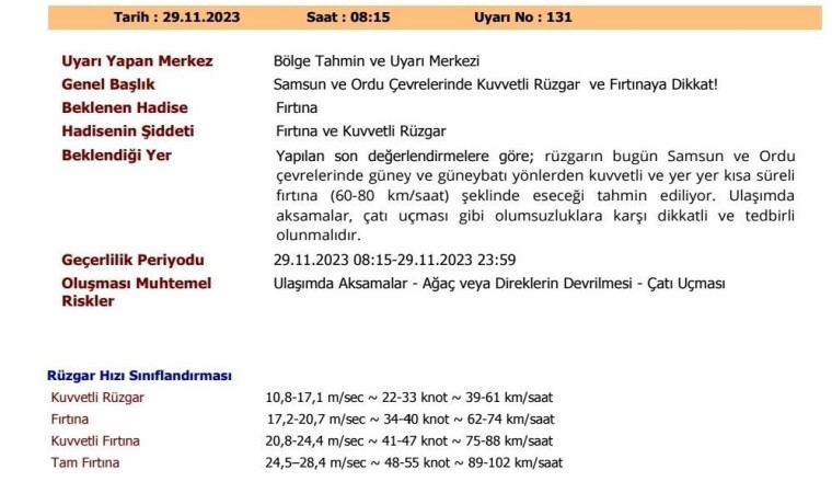 Meteoroloji 10. Bölge Müdürlüğü tarafından ‘fırtına ve kuvvetli rüzgar’ başlıklı bir uyarı yapıldı. Uyarı, cami hoparlörlerinden de paylaşıldı. İl genelindeki cami hoparlörlerinden yapılan anonsta, “Yapılan son değerlendirmelere göre rüzgar bugün Samsun ve çevrelerinde güney ve güneybatı yönünden kuvvetli ve yer yer kısa süreli saatteki hızı 80 km’ye kadar çıkan fırtına şeklinde eseceği tahmin diliyor. Ulaşımda aksamalar, çatı uçması gibi olumsuzluklara karşı dikkatli ve tedbirli olunmalıdır” denildi.