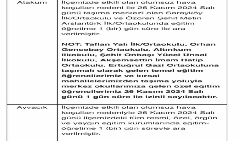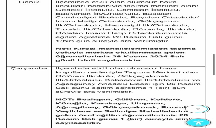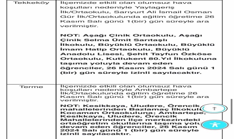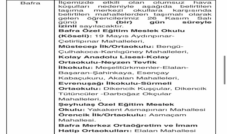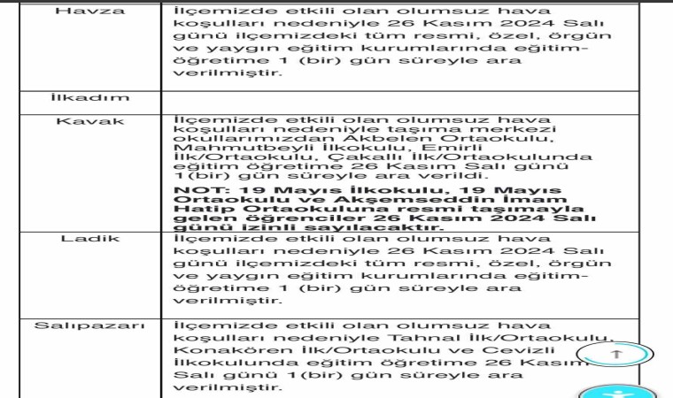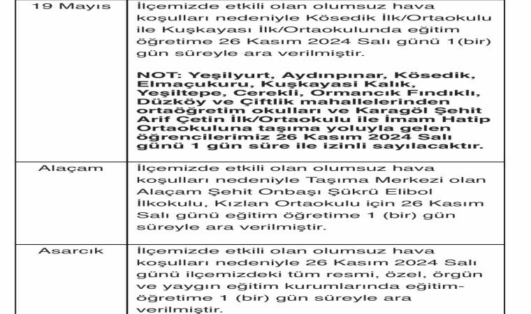 Samsun İl Milli Eğitim Müdürlüğü, kar yağışı ve buzlanma nedeniyle yarın eğitim öğretime ara verilecek okulları duyurdu. İlkadım ilçesi hariç diğer ilçelerde bazı okullara 1 gün süreyle kar tatili verildi.