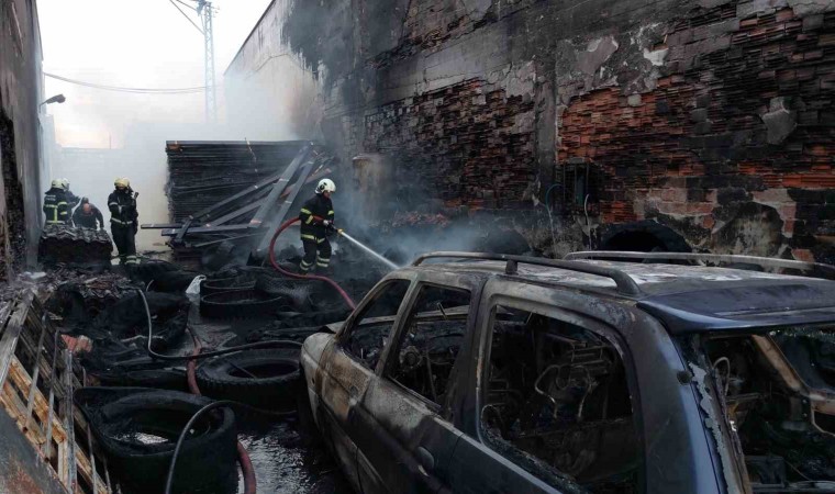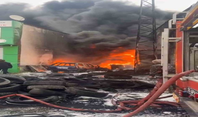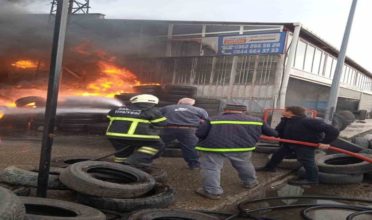 Samsun’da sanayi sitesinde çıkan yangında eski araç lastikleri ile otomobil alevlere teslim oldu.
