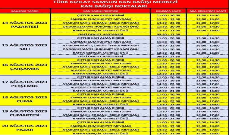 Kızılay’dan yapılan açıklamada 14-15 Ağustos’ta İlkadım Çiftlik Kan Alma Birimi, Samsun Cumhuriyet Meydanı, Atakum Çobanlı İskelesi, 19 Mayıs Hükümet Konağı, Bafra Gençlik Merkezi önü ve Gazi Devlet Hastanesi’nde kan bağışı toplanacak. 16-17 Ağustos’ta İlkadım Çiftlik Kan Alma Birimi, Samsun Cumhuriyet Meydanı, Atakum Çobanlı İskelesi, Alaçam Cumhuriyet Meydanı, Bafra Gençlik Merkezi önü, 18-19-20 Ağustos’ta İlkadım Çiftlik Kan Alma Birimi, Samsun Cumhuriyet Meydanı, Atakum Çobanlı İskelesi ve Bafra Gençlik Merkezi önünde vatandaşların kan verebileceği ifade edildi.