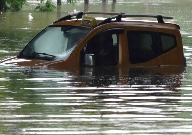 Samsunda taksici selde aracıyla suyun içinde mahsur kaldı