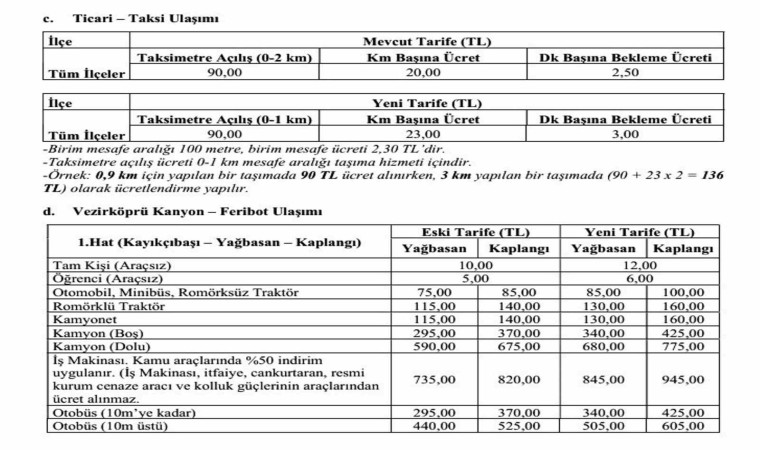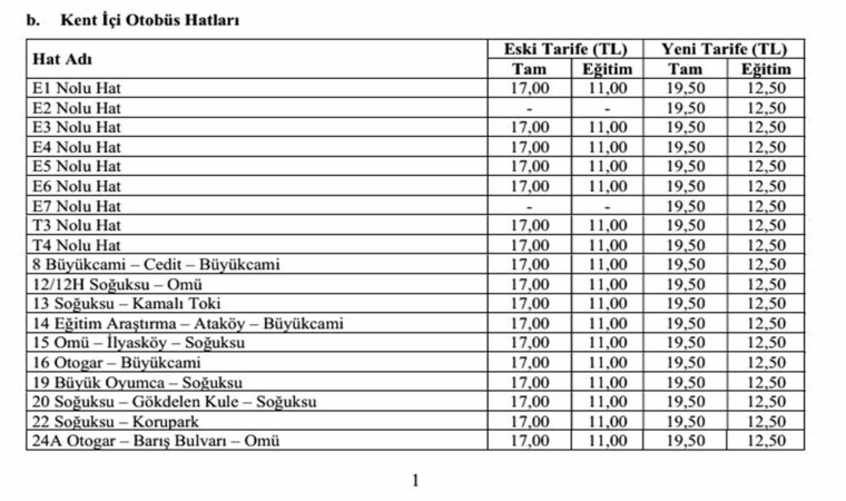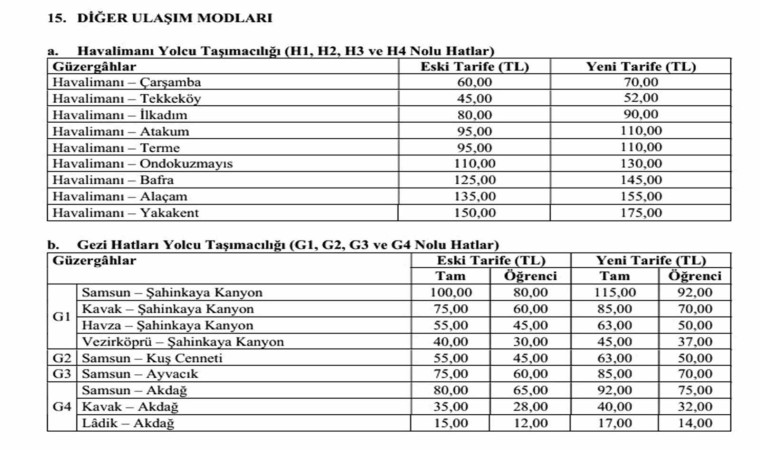 İlçeler ile Samsun merkez arasında yapılan taşımacılık fiyat tarifeleri de yüzde 15 oranında zamlanırken Alaçam-Samsun tam 105 TL, öğrenci 85 TL oldu. Asarcık-Samsun tam 100 TL, öğrenci 80 TL olarak belirlendi. Ayvacık-Samsun tam 85, öğrenci 70 TL olarak güncellendi. Bafra-Samsun tam 70 TL, öğrenci 55 TL. Çarşamba-Samsun tam 60 TL, öğrenci 45 TL. Havza-Samsun tam 115 TL, öğrenci 90 TL. Kavak-Samsun tam 75 TL, öğrenci 60 TL. Ladik-Samsun tam 115 TL, öğrenci 90 TL. 19 Mayıs-Samsun tam 50 TL, öğrenci 40 TL. Salıpazarı-Samsun tam 80 TL, öğrenci 65 TL. Terme-Samsun tam 85 TL, öğrenci 70 TL. Vezirköprü-Samsun tam 150 TL, öğrenci 120 TL. Yakakent-Samsun tam 115 TL, öğrenci ise 90 TL.