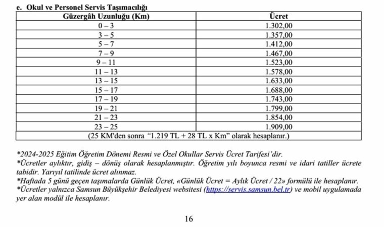 İl idarecilerinin imzası ile birlikte yürürlüğe girecek tarife kapsamında okul ve personel taşımacılığı yapan servis ücretleri en kısa mesafe (0-3 km) bin 302 TL, en uzun mesafe (23-25 km) bin 909 TL oldu.