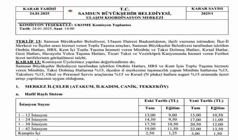 Samsun Büyükşehir Belediyesi Ulaşım Koordinasyon Merkezi (UKOME) Komisyon Toplantısında il genelinde toplu taşıma hizmeti veren araçların ücret tarifesi görüşüldü. Görüşmeler kapsamında otobüs hatları, raylı sistem, minibüs, taksi-dolmuş hatları, ticari taksi, okul-personel servis araçlarına, kırsal (N plaka) hatlara yüzde 15 oranında zam yapılması karara bağlandı.