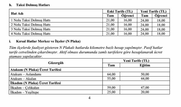 Minibüs-dolmuş hatları fiyat tarifesi güncellemesi kapsamında tam 21 TL’den 24 TL’ye, öğrenci 16 TL’den 18 TL’ye yükseldi. Aynı zamanda 1, 2, 3 ve 4 Nolu Taksi-Dolmuş Hatlarının ücretleri tam 21 TL’den 24 TL’ye, öğrenci 16 TL’den 18 TL’ye çıktı.