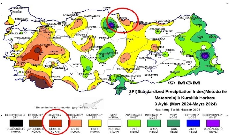 Müdürlüğün Meteoroloji Kuraklık Haritası son 3 aylık verilerine göre de Samsun’da ‘şiddetli kuraklık’ yaşanıyor. Haziran ayında yayımlanan rapora göre Türkiye’deki en kurak yerler, ‘olağanüstü kurak’ olarak nitelendirilen Antalya ve Uşak olarak dikkat çekerken, Samsun ise ’şiddetli kuraklık’ ile yağışsızlıkta bu illeri takip etti. Kuraklık tablosuna en riski kategori ’olağanüstü’ olarak nitelendirilirken bunu ’çok şiddetli kurak’, ’şiddetli kurak’, ’orta kurak, ’hafif kurak’, ’normal civarı’, ’hafif nemli’, ’orta nemli’, ’çok nemli’, ’aşırı nemli’ ve ’olağanüstü nemli’ kategorileri takip ediyor.