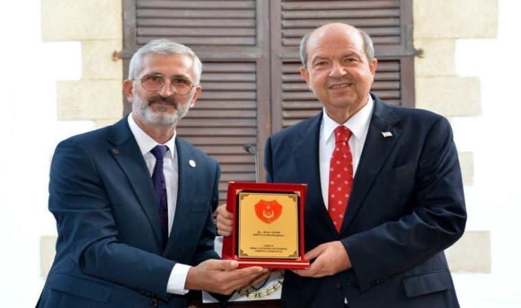 Başkanı Yardımcısı Necati Usta, ziyaretin sonunda Cumhurbaşkanı Tatar’a plaket takdim etti.