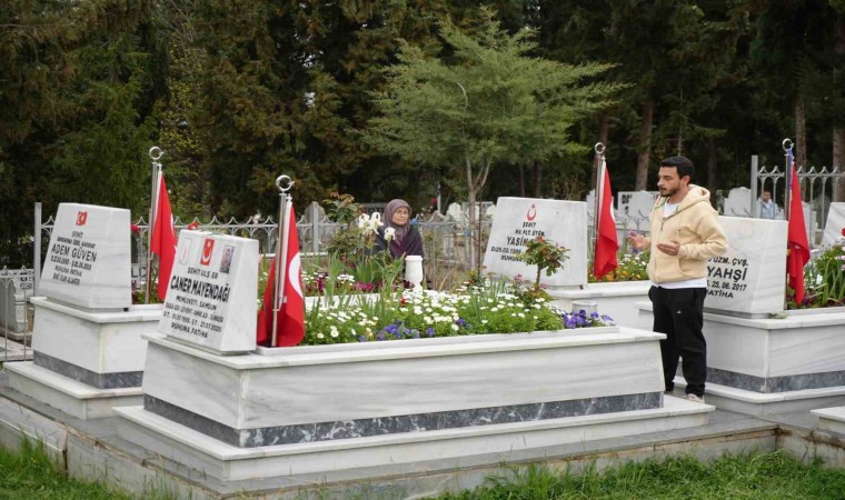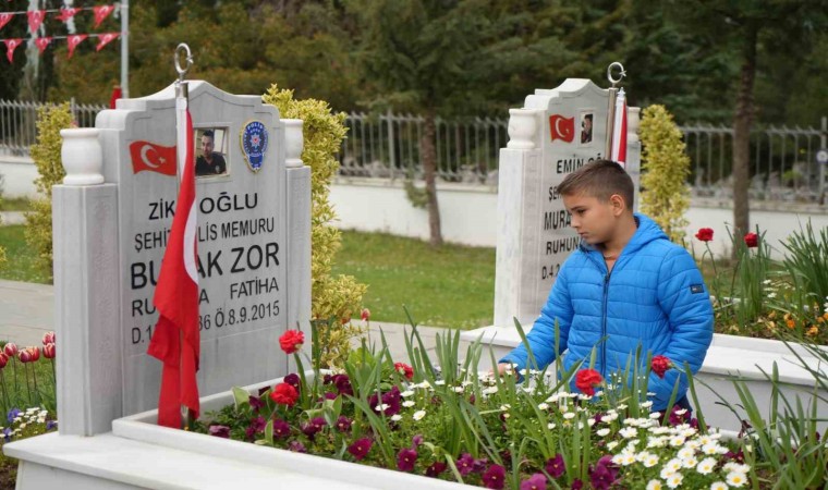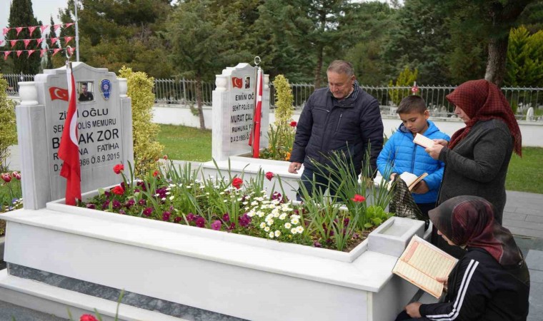 Mezarlıklarda yine en hüzünlü yerler şehitlikler oldu. Aileler, vatan için canlarını feda eden yakınlarının kabirlerine koştu. Mezar taşlarındaki yakınlarının fotoğraflarını öpen aileler, Kur’an-ı Kerim okuyup onların ruhuna hediye etti. Babalarını genç yaşta kaybeden şehit çocukları da mezarlıkta hüzün dolu anlar yaşadı.