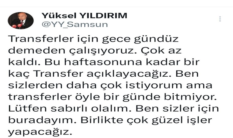 Trendyol Süper Lig takımlarından Samsunspor’da Başkan Yıldırım sosyal medya hesabından yaptığı açıklamada, "Transferler için gece-gündüz demeden çalışıyoruz. Çok az kaldı. Bu hafta sonuna kadar birkaç transfer açıklayacağız. Ben sizlerden daha çok istiyorum ama transferler öyle bir günde bitmiyor. Lütfen sabırlı olalım. Ben sizler için buradayım. Birlikte çok güzel işler yapacağız" ifadelerini kullandı.