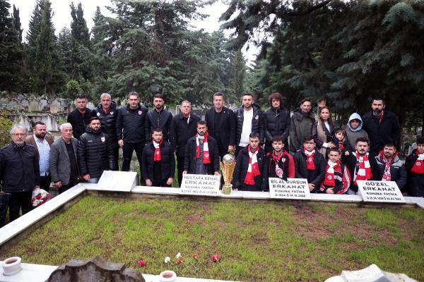 Pazar günü görkemli bir törenle kupasını alan Samsunspor’da Başkan Vekili Veysel Bilen, Genel Müdür Soner Soykan, Samsunspor Kulübü Derneği Yönetim Kurulu Üyeleri, Teknik Direktör Hüseyin Eroğlu, futbolcular ve taraftarlar vefa örneği göstererek şampiyonluk kupasını vefat eden kulübün eski başkanları, yöneticileri ve taraftarların mezar üstüne götürdü.