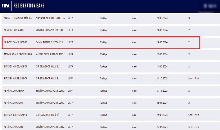 Süper Lig ekiplerinden Samsunspor’un 2 dönem transfer yasağı, FIFA’nın ‘yasak kayıtları’ listesine eklendi. Kararın geçerlilik süresi ise 24 Haziran’dan itibaren 2 transfer dönemini kapsıyor.