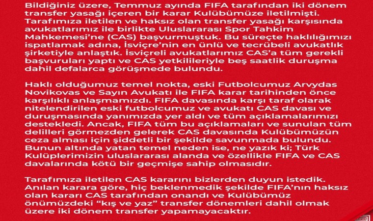 Samsunspor Kulübü’nden konuyla ilgili resmi internet sitesinden yapılan açıklamada, "Bildiğiniz üzere, temmuz ayında FIFA tarafından iki dönem transfer yasağı içeren bir karar kulübümüze iletilmişti. Tarafımıza iletilen ve haksız olan transfer yasağı karşısında avukatlarımız ile birlikte CAS’a başvurmuştuk. Bu süreçte haklılığımızı ispatlamak adına, İsviçre’nin en ünlü ve tecrübeli avukatlık şirketiyle anlaştık. İsviçreli avukatlarımız CAS’a tüm gerekli başvuruları yaptı ve CAS yetkilileriyle beş saatlik duruşma dahil defalarca görüşmede bulundu. Haklı olduğumuz temel nokta, eski futbolcumuz Arvydas Novikovas ve avukatı ile FIFA karar tarihinden önce karşılıklı anlaşmamızdı. FIFA davasında karşı taraf olarak nitelendirilen eski futbolcumuz ve avukatı CAS davası ve duruşmasında yanımızda yer aldı ve tüm açıklamalarımızı destekledi. Ancak, FIFA tüm bu açıklamaları ve sunulan tüm delilleri görmezden gelerek CAS davasında kulübümüzün ceza alması için şiddetli bir şekilde savunmada bulundu. Bunun altında yatan temel neden ise ne yazık ki; Türk kulüplerimizin uluslararası alanda ve özellikle FIFA ve CAS davalarında kötü bir geçmişe sahip olmasıdır. Tarafımıza iletilen CAS kararını bizlerden duyun istedik. Anılan karara göre, hiç beklenmedik şekilde FIFA’nın haksız olan kararı CAS tarafından onandı ve kulübümüz önümüzdeki ’kış ve yaz’ transfer dönemleri dahil olmak üzere iki dönem transfer yapamayacaktır" denildi.