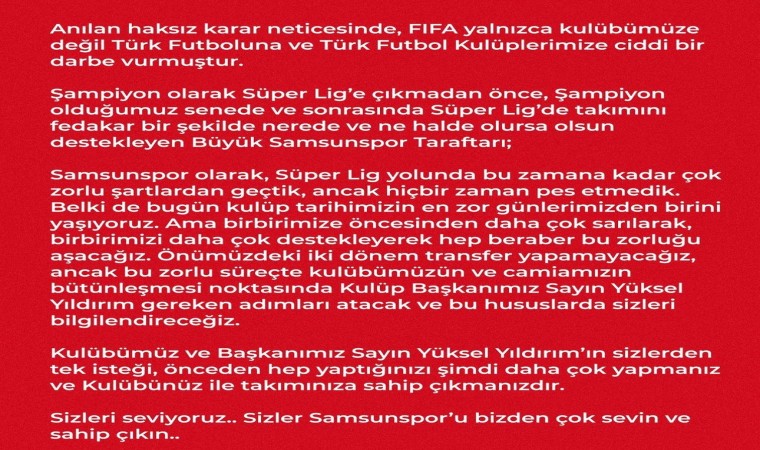Alınan haksız karar neticesinde, FIFA’nın sadece kendilerine değil, Türk futboluna ve Türk futbol kulüplerine ciddi bir darbe vurduğunun belirtildiği açıklamanın devamında, "Şampiyon olarak Süper Lig’e çıkmadan önce, şampiyon olduğumuz senede ve sonrasında Süper Lig’de takımını fedakar bir şekilde nerede ve ne halde olursa olsun destekleyen büyük Samsunspor taraftarı; Samsunspor olarak, Süper Lig yolunda bu zamana kadar çok zorlu şartlardan geçtik ancak hiçbir zaman pes etmedik. Belki de bugün kulüp tarihimizin en zor günlerimizden birini yaşıyoruz. Ama birbirimize öncesinden daha çok sarılarak, birbirimizi daha çok destekleyerek hep beraber bu zorluğu aşacağız. Önümüzdeki iki dönem transfer yapamayacağız ancak bu zorlu süreçte kulübümüzün ve camiamızın bütünleşmesi noktasında Kulüp Başkanımız Sayın Yüksel Yıldırım gereken adımları atacak ve bu hususlarda sizleri bilgilendireceğiz. Kulübümüz ve Başkanımız Sayın Yüksel Yıldırım’ın sizlerden tek isteği, önceden hep yaptığınızı şimdi daha çok yapmanız ve kulübünüz ile takımınıza sahip çıkmanızdır. Sizleri seviyoruz. Sizler Samsunspor’u bizden çok sevin ve sahip çıkın" ifadeleri kullandı.