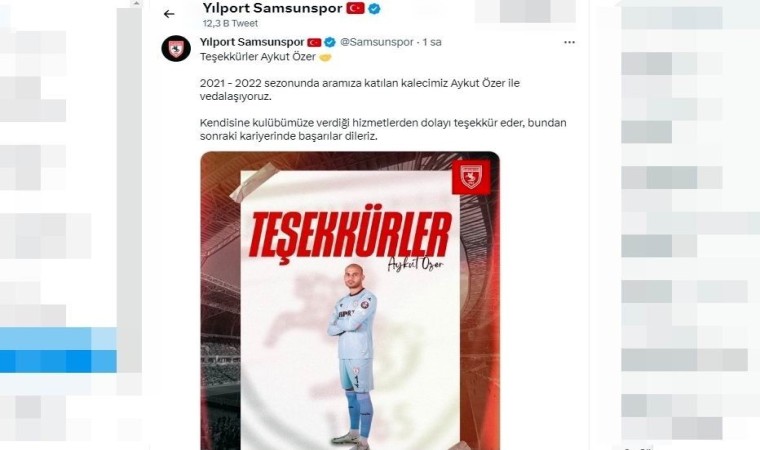 Samsunspor Kulübü tarafından yapılan resmi açıklamada, bu ayrılığa ilişkin şu ifadeler yer aldı: “Samsunspor olarak kalecimiz Aykut Özer'e teşekkür ederiz. Aykut Özer, 2021-2022 sezonunda kulübümüze katılmış ve 2 yıl boyunca Samsunspor formasını 15 müsabakada temsil etmiştir. Kendisine kulübümüze verdiği hizmetler için teşekkür ediyor, gelecekteki kariyerinde başarılar diliyoruz.”