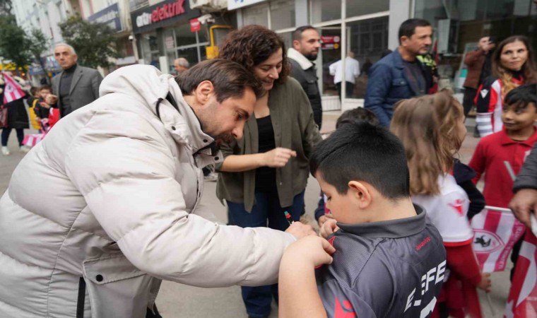 Maçın ardından eski futbolcular, minik öğrencilerin formalarını imzalayıp fotoğraf çekildi.