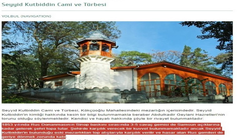 Samsun İl Kültür ve Turizm Müdürlüğü resmi internet sitesinde mezarlık ve türbe hakkında detaylı bilgi yer alıyor. Web sitesinde, “1853 yılında Rus Donanmasının Sinop baskını sırasında 3-5 savaş gemisi de Samsun açıklarına kadar gelerek şehri topa tutar. Şehirde karşılık verecek bir kuvvet bulunmamaktadır. Ancak Seyyid Kutbiddin Türbesi’nin bulunduğu eski mezarlıktan top atışlarıyla karşılık verilir ve hasar alan Rus gemileri de geriye dönmek zorunda kalır” deniliyor.