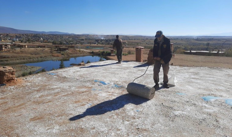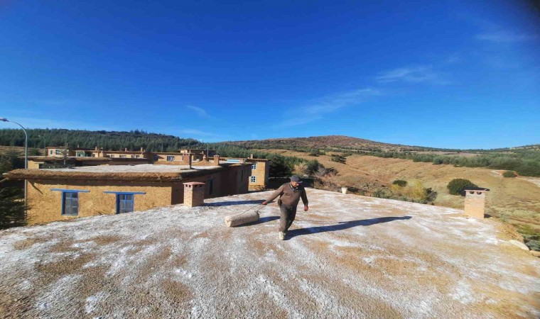 Konya’nın Hüyük ilçesinde sanatçılar için oluşturulan Sonsuz Şükran Köyü’ndeki kerpiç evlerin düz toprak damlarında yürütülen yuvak mesaisi sürüyor.