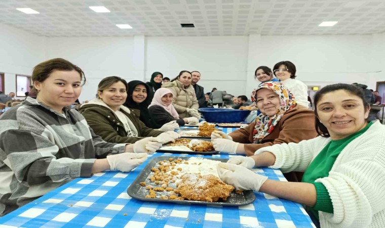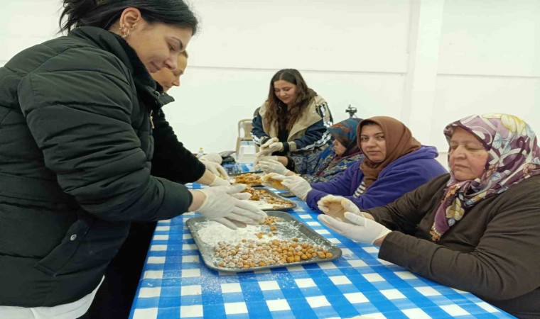 Sütçüler Mahallesinde kazanlarda pişen buğdaylar, davul zurna eşliğinde dövülürken, düğün salonunda kadınlar da topalak yuvarlama işini yaptı.