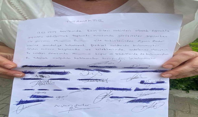 Olay anını anlatan siyte sakini Aysun Bodur, "Site yönetimine girmem hakkında teklif yapılınca ben de toplantıda bazı görüşlerimi söylemek istedim. Biz 34 daireli küçük bir siteyiz ve gelirimizin çoğunu hizmetli için veriyoruz. Kendisi geçen yıl emekli olmuş ve zaten emekli maaşı alan biri için tekrar 30 sigorta primi ödemeyelim diye yan sitedeki yöneticilerle görüştüğüm ve çeşitli alternatifler sundular. Bana en mantıklı gelen part-time sistemiydi. Evinde yine oturacak, belli bir miktar maaş alacak ve diğer giderleri de karşılanacaktı. Biz de primimizi onun çalıştığı o saatlere göre ödeyecektik. Bunu anlatmaya başladım ve daha cümlemi bitirmeden bu beyefendi altında oturduğu metal ayaklı bir sandalyeyi havaya kaldırarak hışımla üzerime doğru geldi. Ben o esnada sadece sandalyeyi havada gördüm ve refleks olarak sağa doğru kaydım. O esnada sandalye ile boynuma vurdu ve ben darbeyle geriye doğru düştüm. Ben yerde yatarken 4-5 kişi onu hala tutmaya çalışıyordu ve hala bana küfür edip sandalyeyle vurmaya çalışıyordu. Geriye düşmeseydim kesin bir kaç darbe daha şansım vardı. O esnada arkadaşlar onu dışarıya çıkarırlarken ’Ya sen, ya ben’ diyerek tehdit ederek ortamı terk etti" dedi. Daha sonra hastaneden darp raporu aldığını söyleyen Bodur, polis merkezine giderek M.B.’den şikayetçi oldu.