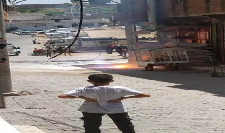 Şanlıurfa’da elektrik direğinden kopan elektrik kablosu dakikalarca sokak ortasında bomba gibi patladı. Mahallede yaşanan panik anları cep telefonu kamerasına yansıdı.