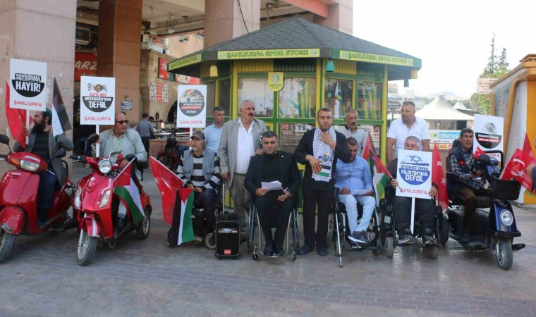 Şanlıurfa’da bir araya gelen engelli dernekleri üyeleri, İsrail’in Gazze’ye yönelik saldırılarını basın açıklamasıyla kınadı.