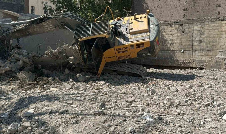 Şanlıurfa’da depremde ağır hasar alan 4 katlı bina, yıkım sırasında iş makinesinin üzerine devrildi. Operatör olaydan yara almadan kurtuldu.