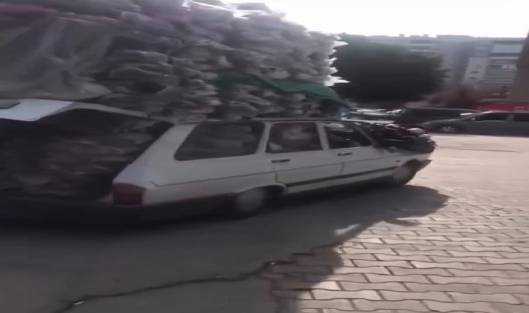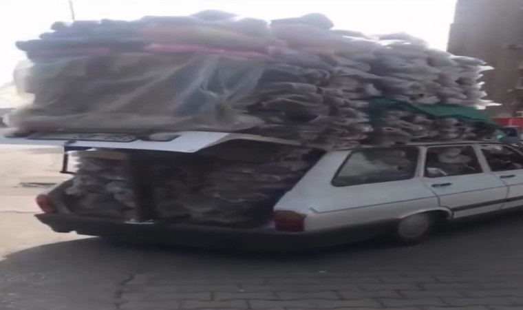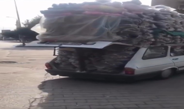 Şanlıurfa’da seyir halinde devam eden ve plakası, sürücüsü öğrenilemeyen ve üzerinde aşırı yük olan otomobili görenler hayrete düştü. Hem bagajda, hem de otomobilin tavan kısmında yüklü miktarda torbalarla eşya taşıyan sürücü bu görüntüsüyle kamyonetlere adeta kafa tuttu. Aşırı yükten bagajın kapağı kapanmazken, otomobilin tavanında yüklü miktarla terlik olduğu öğrenilen torbalar görenleri şaşkına çevirdi. Sürücünün torbaları gelişigüzel bağladığı da gözden kaçmadı.