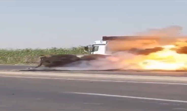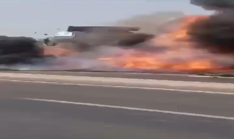 Şanlıurfa’da seyir halindeki saman yüklü tır alev alev yandı. Yangın sonrası araç kullanılamaz hale geldi.