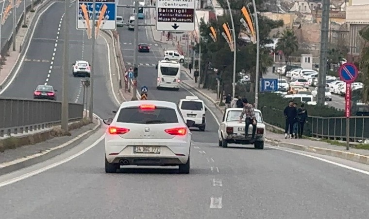 Edinilen bilgiye göre olay, Şanlıurfa’nın Eyyübiye ilçesine bağlı Karakoyunlu Mahallesi İpekyol Caddesi üzerinde yaşandı. Bir şahıs, seyir halindeki bir otomobilin bagaj kapağının üzerinde yolculuk yaptı. Trafikte ilerleyen otomobilin üzerindeki şahsın tehlikeli yolculuğu kameraya yansıdı. Şahsın rahat tavırları dikkatlerden kaçmazken yan yola giren otomobil gözden kayboldu.