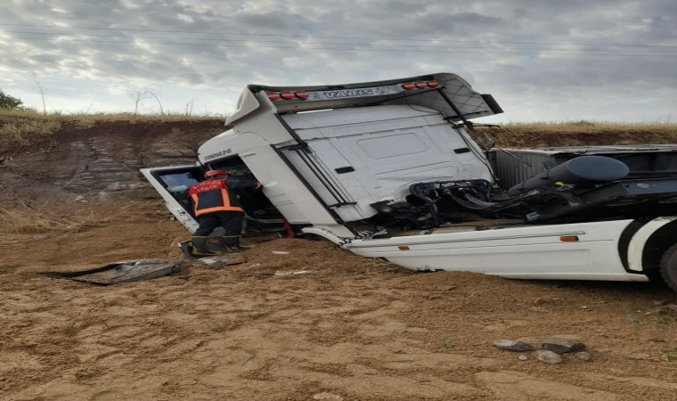 Şanlıurfa’da kontrolden çıkarak devrilen tırın sürücüsü yaralandı.