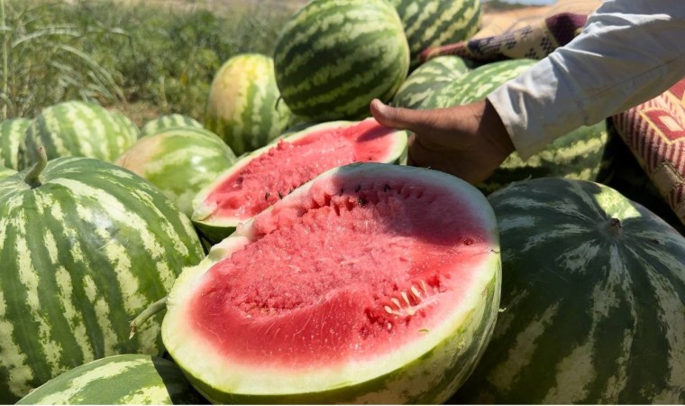 Şanlıurfa’nın Suruç ilçesinde ova karpuzu olarak adlandırılan yerli karpuzun hasadına başlandı. Marketlerde kilosu 10 liraya kadar alıcı bulan karpuzun tarladaki fiyatının ise 2 lira civarında olduğu öğrenildi.