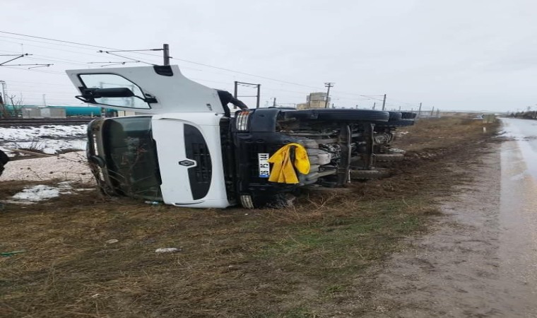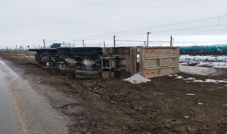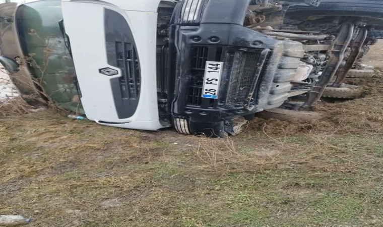 Eskişehir’de tekerinin bankete kaptırılması sonucu kontrolden çıkarak şarampole devrilen kamyonun sürücüsü yaralandı.
