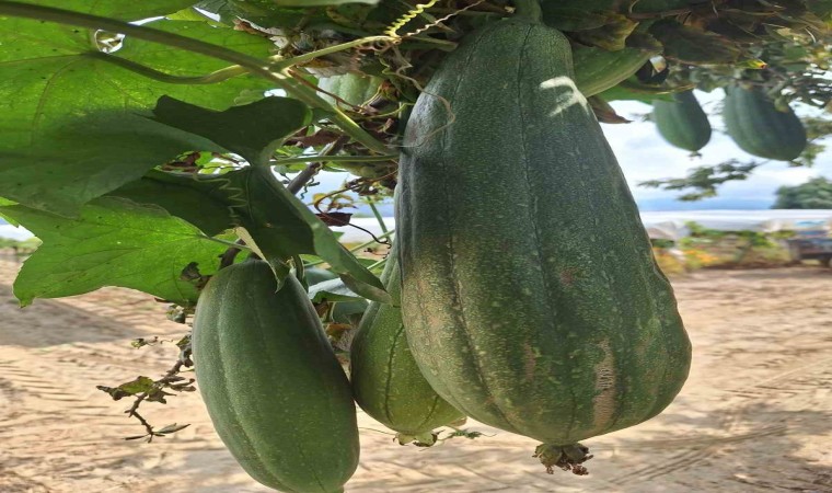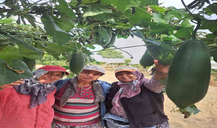 Manisa’nın Sarıgöl ilçesi Emcelli Mahallesi’nde yaşayan üzüm üreticisi Salih Hancı, kendisine hediye olarak verilen ve mart ayında üzüm bağının kenarına diktiği birkaç adet lif kabağı tohumundan 50’nin üzerinde ürün aldı.