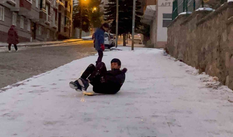 Hava sıcaklığının eksi 10 dereceyi bulduğu Sarıkamış’ta, soğuğa aldırış etmeden kayan çocuklar, düşe kalka kayarak eğlendi.